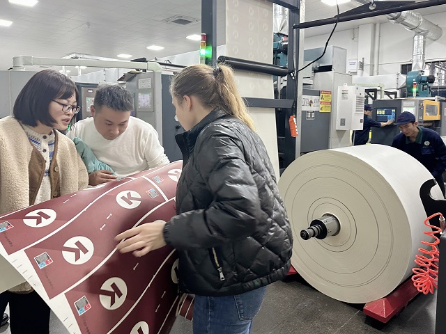 (业务员和客户在纸杯印刷车间����� �������Ƴ������������ �������Ƴ����������� �������Ƴ������������ �������Ƴ�������对纸杯印刷进行确认)